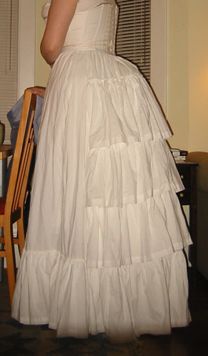 I used Folkwear's chemise pattern (as it was the only one I could find with a low enough neckline) and Laughing Moon's 1870-1895 Petticoat pattern.