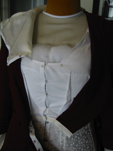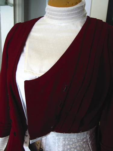 I decided mid-way through putting this together that I want to change the way the bodice fastens. The original fastens CB with hooks and eyes, which is easier to do but less attractive to look at. After looking at the detailed drawings of the closures in this 1908 bodice from Nancy Bradfield's Costume in Detail, I decided to adapt this -- which means that the CF overlaps will become functional, with the bodice lining hooking CF and the net inset hooking down to the bodice lining. I'll probably go ahead and keep the buttons decorative, and either hook or snap the bodice overlap at CF closed.