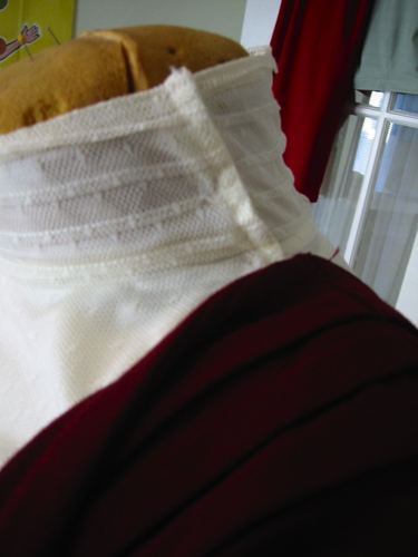 Then it was on to the collar... this was the first high collar I've made, so I wasn't entirely sure what I was doing. I basically measured how high I thought I wanted it to go and then looked at the 1900-09 collar patterns in Period Costume for Stage & Screen and just messed around until I got something I liked. I wanted tucks in the net as in the original, so I sewed in pintucks into the net before I cut out the collar. Luckily I went ahead and tucked the whole 60" width, because my first attempt at a collar ended up closing on the wrong side... (hitting head) so I had to recut and resew the whole thing. Crikey! Luckily the net is stiff enough that I don't need to use collar stays.