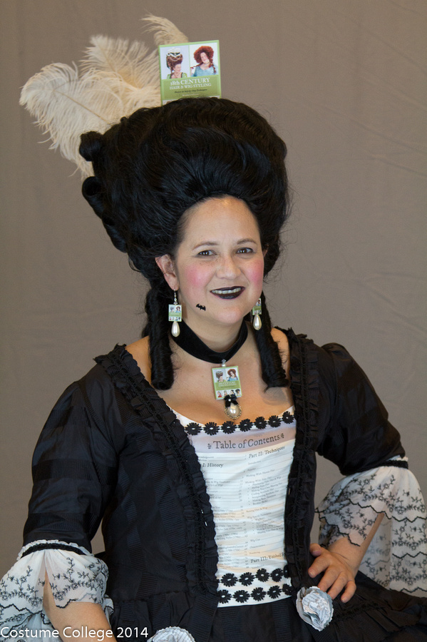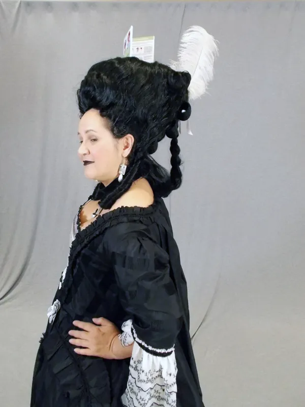 Reproduction based on extant 1770s robes à la française. Draped using historical construction and fitting techniques. Reproduction 1770s wig.